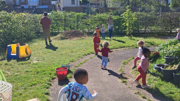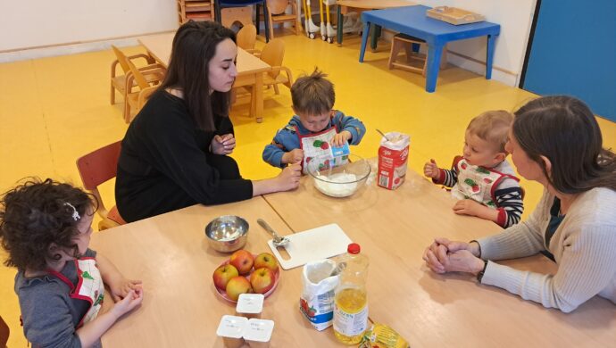 Au programme aujourd'hui c'était un atelier enfant-parent autour de la cuisine. Confection d'un gâteau aux pommes pour le goûter ! Pendant ce temps, les petits et les moyens