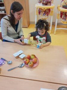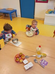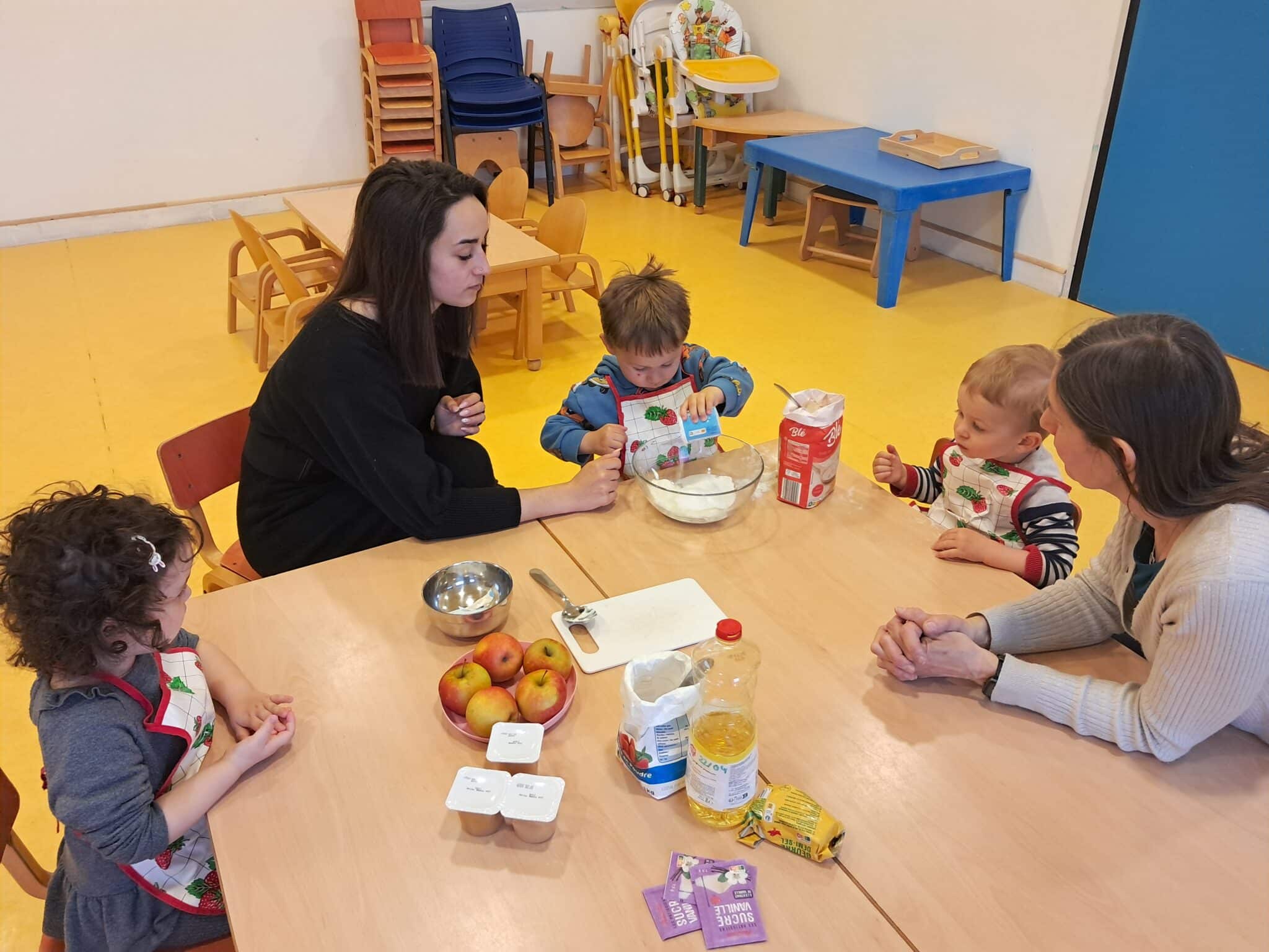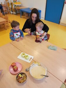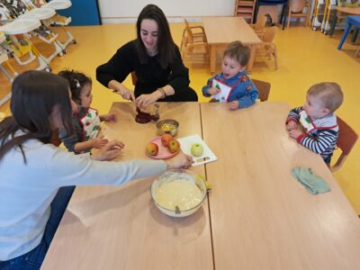 Au programme aujourd’hui c’était un atelier enfant-parent autour de la cuisine. Confection d’un gâteau aux pommes pour le goûter !