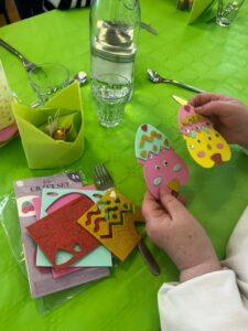 L’après-midi s’est poursuivi dans la bonne humeur avec une activité créative : décoration d’œufs de Pâques et fabrication de petits personnages en feutrine (lapins, moutons, œufs colorés…). Un grand bravo au gagnant du plus bel œuf décoré